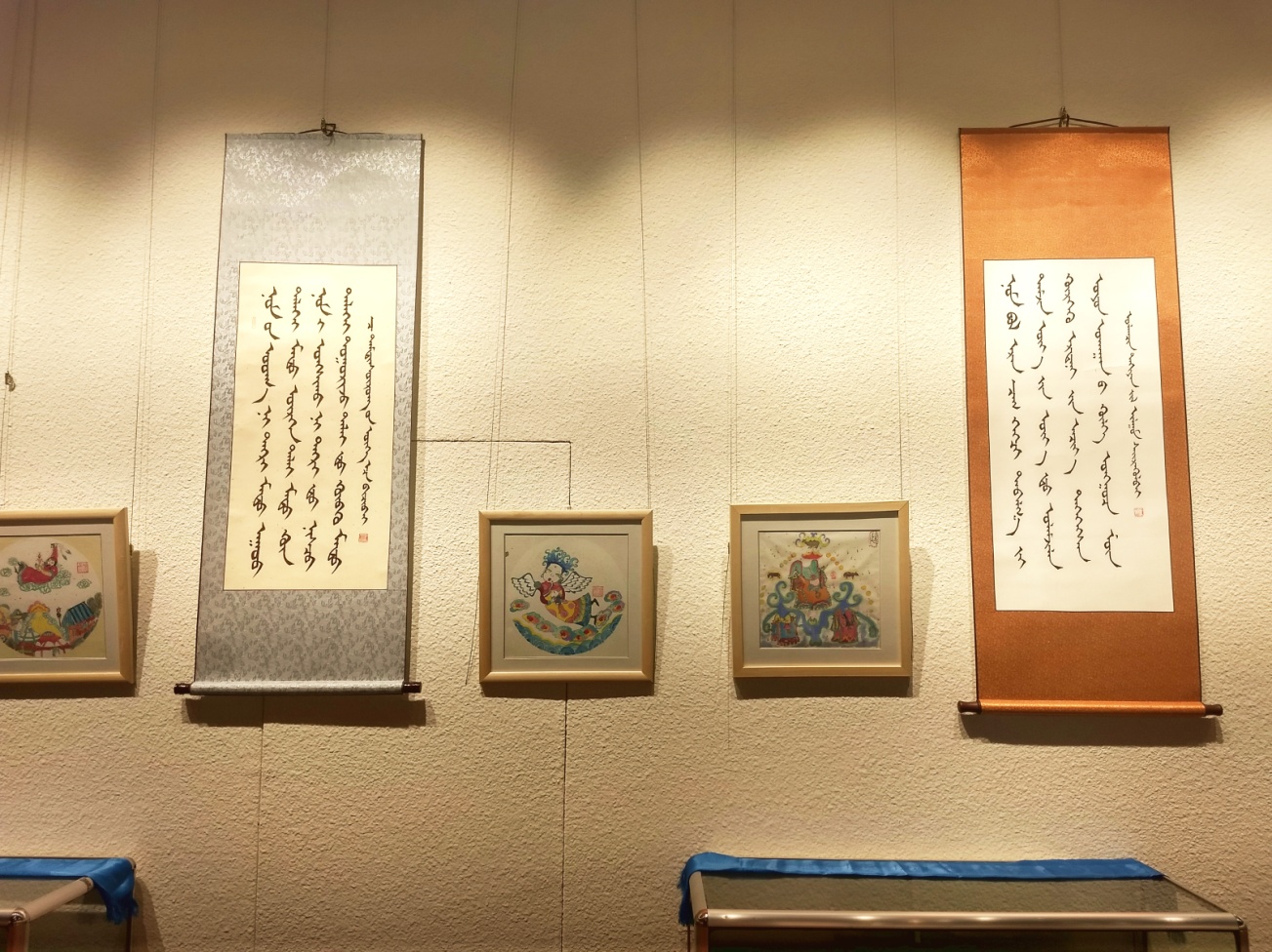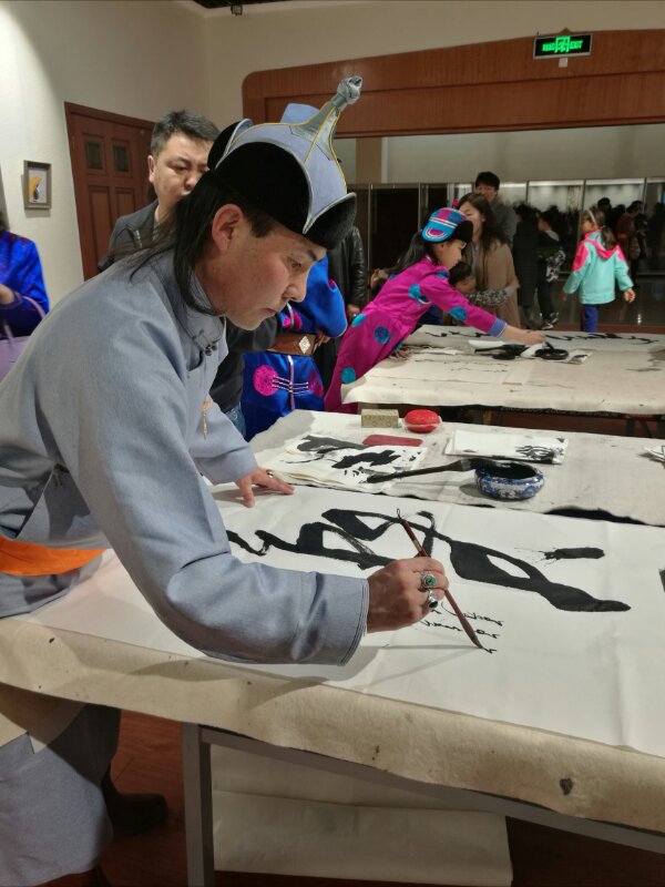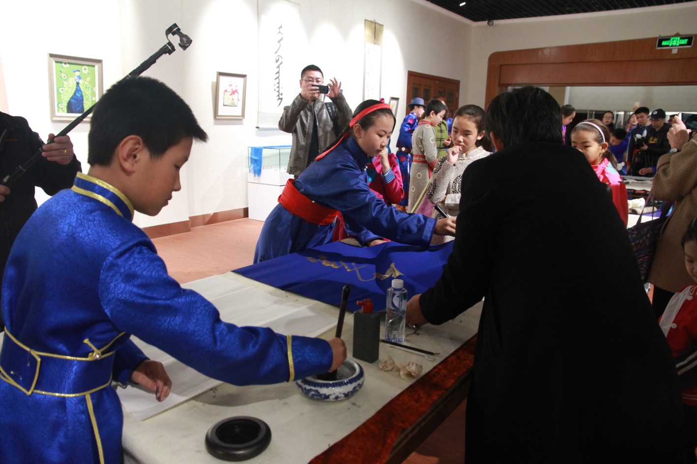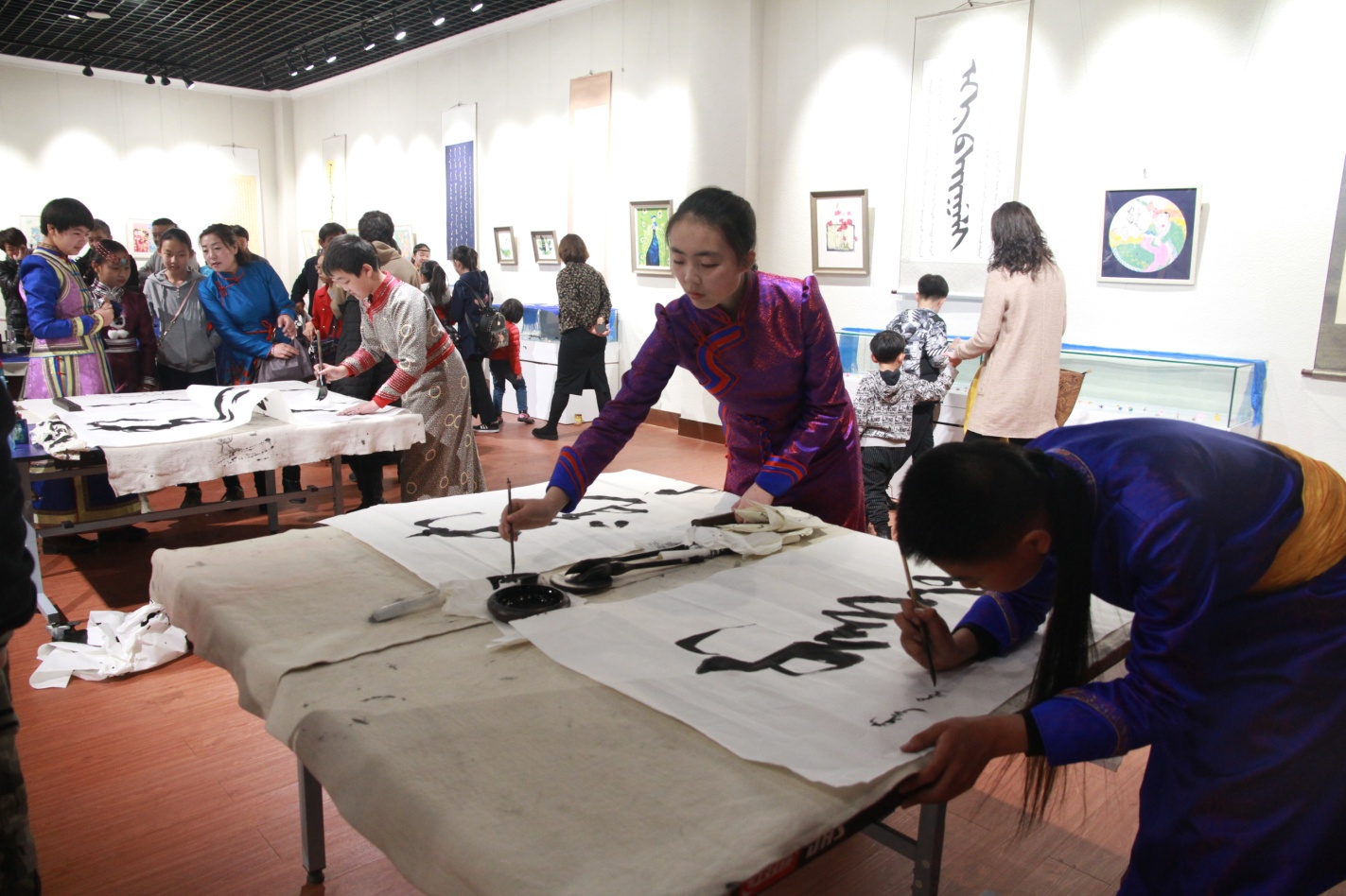 我校太阳集团tyc539行政办公室主任兼民族博物馆负责人青斯琴、内蒙古书法家协会副会长德格吉乐图、内蒙古师范大学美术学院美术史论教研室主任朝鲁分别致辞,充分肯定了此次展览的重要意义。展览期间,呼和浩民族实验学校部分学生现场展示蒙古文书法。