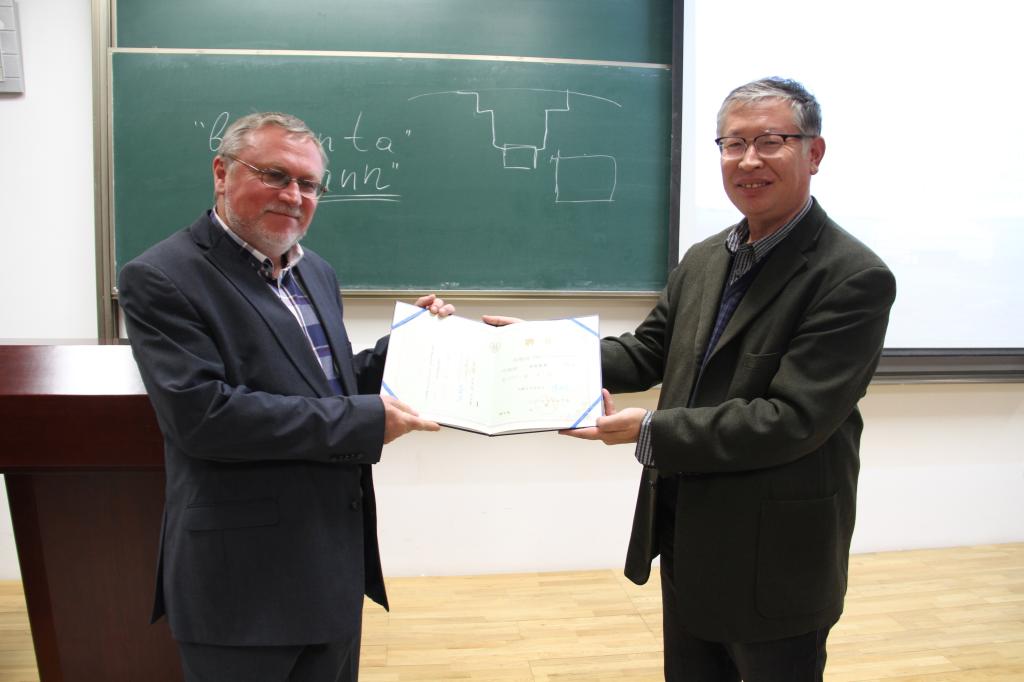 2016年10月14日下午,太阳成集团tyc539在南校区举行聘任仪式,聘请尼古拉.尼古拉维奇.卡拉丁(NikolayNikolaevichKradin)教授为太阳成集团tyc539客座教授,太阳集团tyc539院长那顺巴依尔教授为尼古拉.尼古拉维奇.卡拉丁(NikolayNikolaevichKradin)教授颁发了证书。