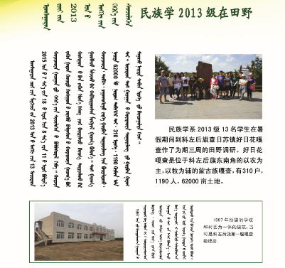 2015年8月,我院2013级民族学同学在民族学系教师阿拉坦宝力格教授、梅花教授和格日乐图博士的带领下,分两处在通辽市科尔沁左翼后期查日苏镇好日花嘎查与赤峰市巴林右旗翁根毛都嘎查进行了为期三周的田野调查。作为民族学的重要研究方法,此次调查意在通过实际操作、亲身访谈帮助同学们更好地将理论与实践相结合,从而提高该专业同学们的研究能力,为日后进行民族学的深入学习作基础。在实习结束后,参与实习的同学制作了实习展板,供师生交流学习。实习最终取得良好成效,同学们纷纷反映收获颇丰。
