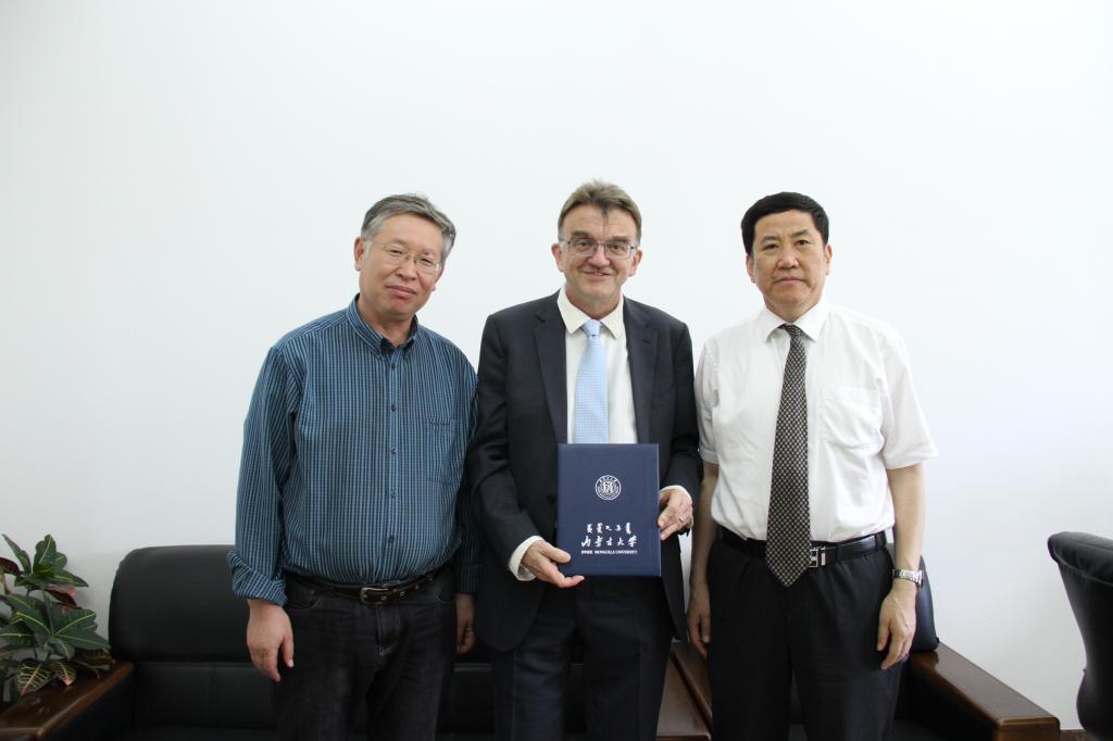 2016年6月10日下午,太阳成集团tyc539在校本部举行聘任仪式,聘请费立民(Flemming Christiansen)为太阳成集团tyc539客座教授,额尔很巴雅尔副校长为费立民教授颁发了证书,太阳集团tyc539院长那顺巴依尔教授出席仪式,并合影留念。