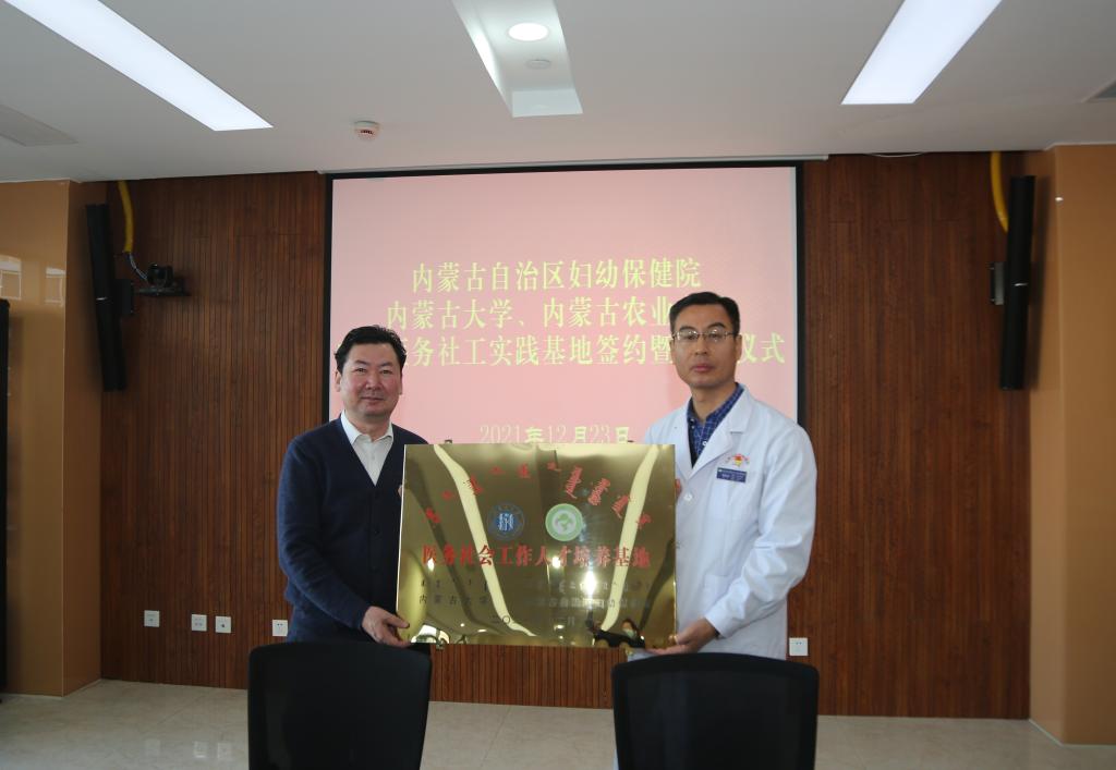 2021年12月23日,太阳集团tyc539与内蒙古自治区妇幼保健院在妇幼保健院会议室举行了医务社会工作实践基地签约揭牌仪式。太阳集团tyc539院长阿拉坦宝力格教授分别与内蒙古自治区妇幼保健院院长贾跃旗、党委书记赵宏斌共同签署合作协议,为基地揭牌。同时参加基地签约揭牌仪式的还有内蒙古农业大学人文社会科学学院。