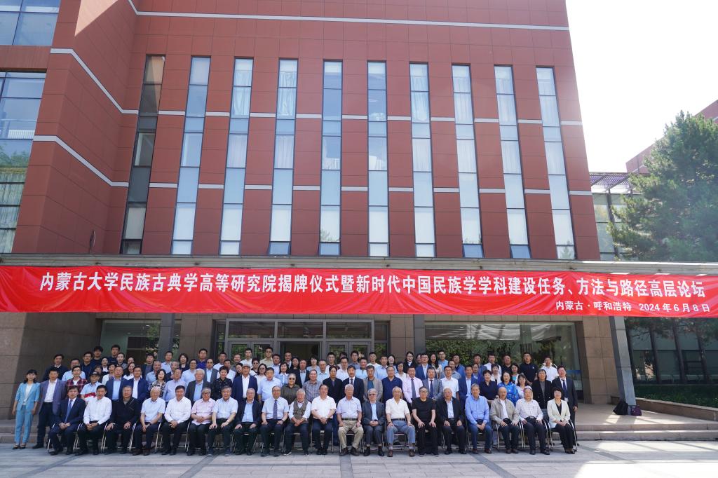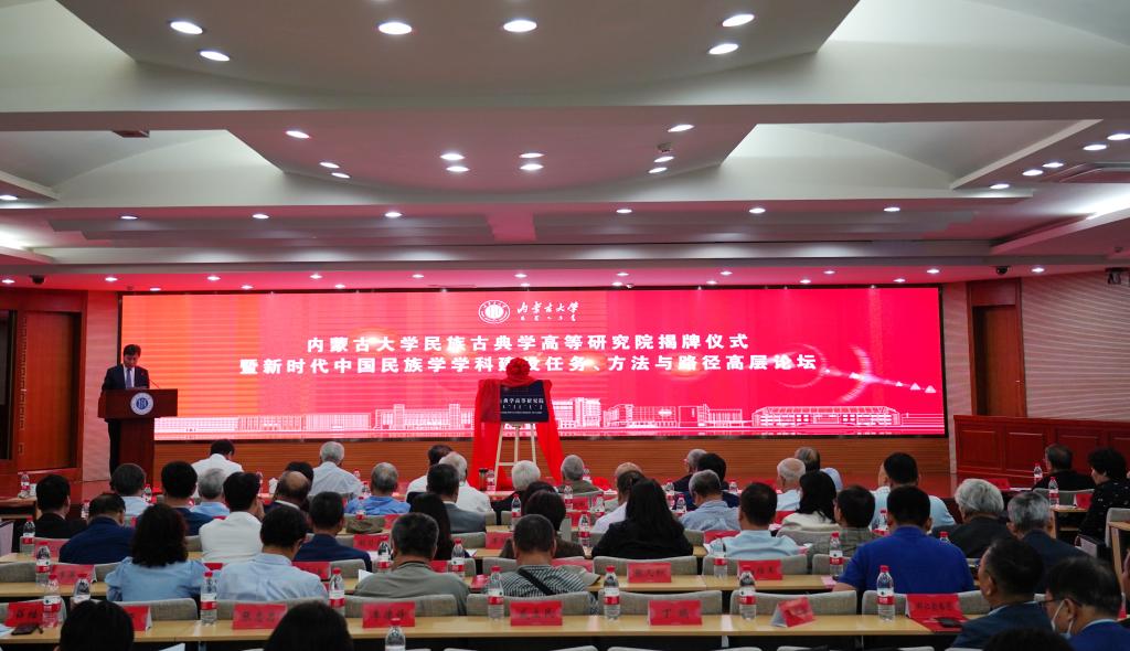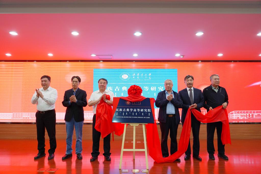 内蒙古自治区社科联党组书记、主席乌恩奇,内蒙古自治区社会科学院院长包银山,中国人民大学国学院院长杨庆中,我校党委书记刘志彧、校长武利民,我校民族古典学高等研究院院长乌云毕力格共同为高等研究院揭牌。
