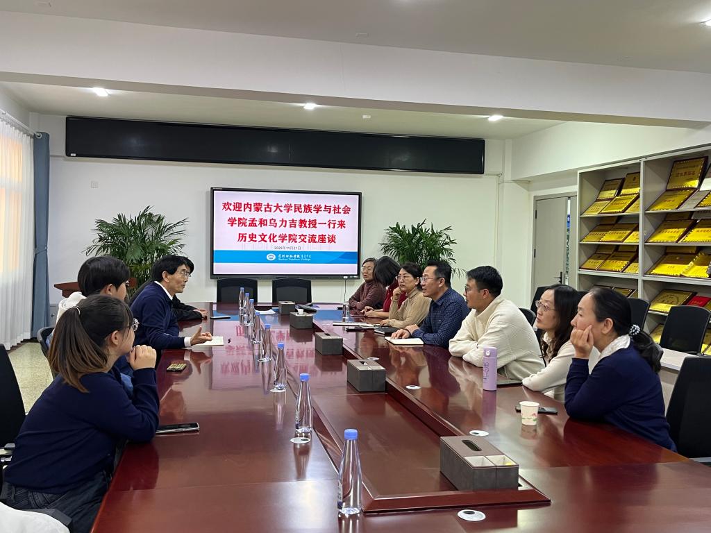 接着师生一行来到历史文化学院。历史文化学院党总支书记张迎峰、副院长张淑利及阴山文化研究中心部分教师参加座谈。张淑利副院长系统介绍了学院发展历程及阴山文化研究中心建设情况,期待与内大在环境史、社会史和文化史等领域开展联合调研,共同拓展研究路径。