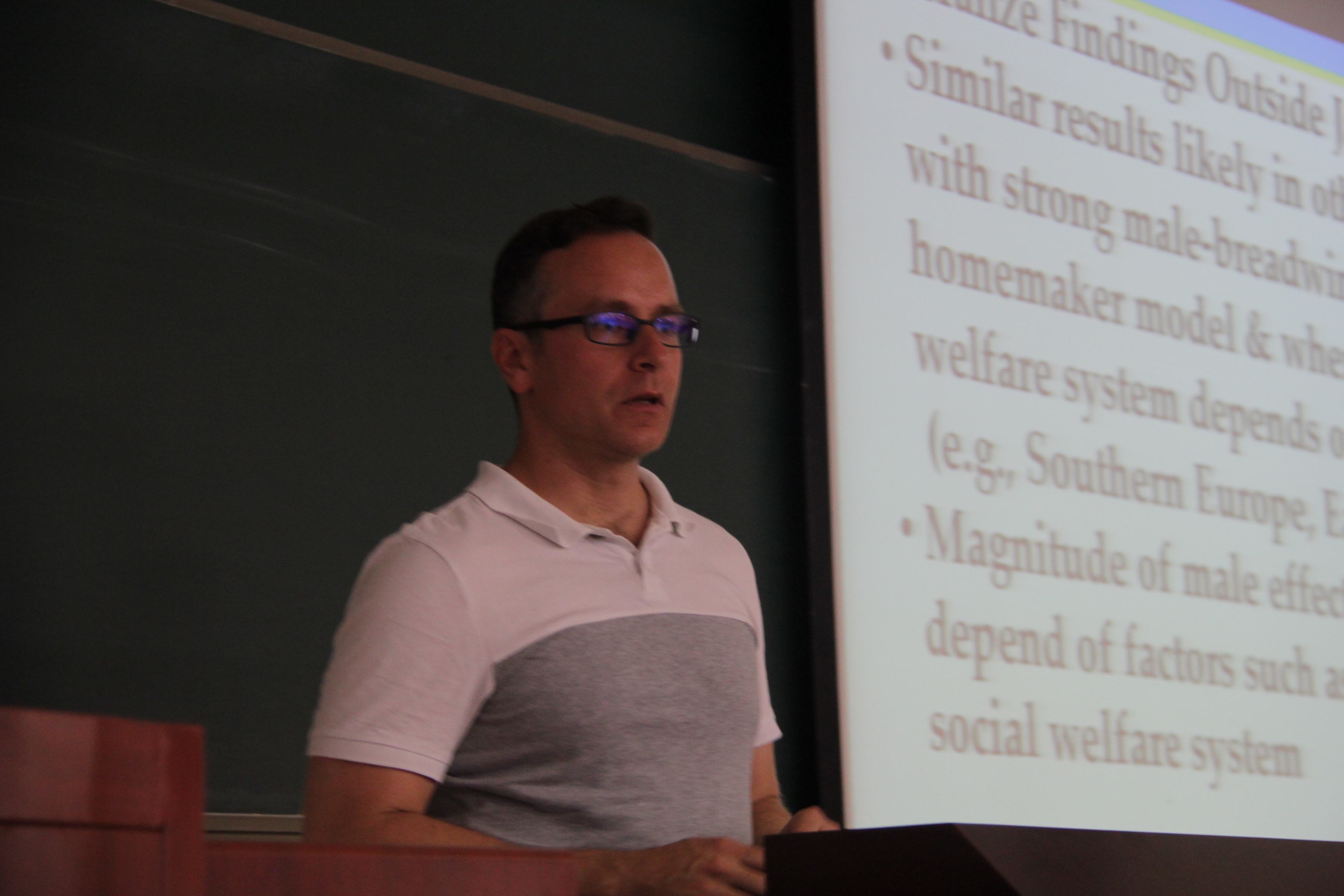 首先,由朝鲁对Martin Piotrowski副教授的研究背景、学术专长以及俄克拉荷马大学社会学研究基本情况进行简要介绍,接着Martin Piotrowski副教授运用《2009年日本全国家庭与经济状况调查数据》,对上世纪80年代前后出生的日本青年晚婚、低生育与其时劳务派遣业兴起之间关系进行深入细致的分析。最后,Martin Piotrowski副教授与在座老师和学生进行精彩互动,并就中国相关劳务工作现行状况、中国与日本男主外-女主内家庭分工传统及当前现状、定量研究方法以及俄克拉荷马大学社会学系招生与访学等情况进行了热烈的交流与互动。