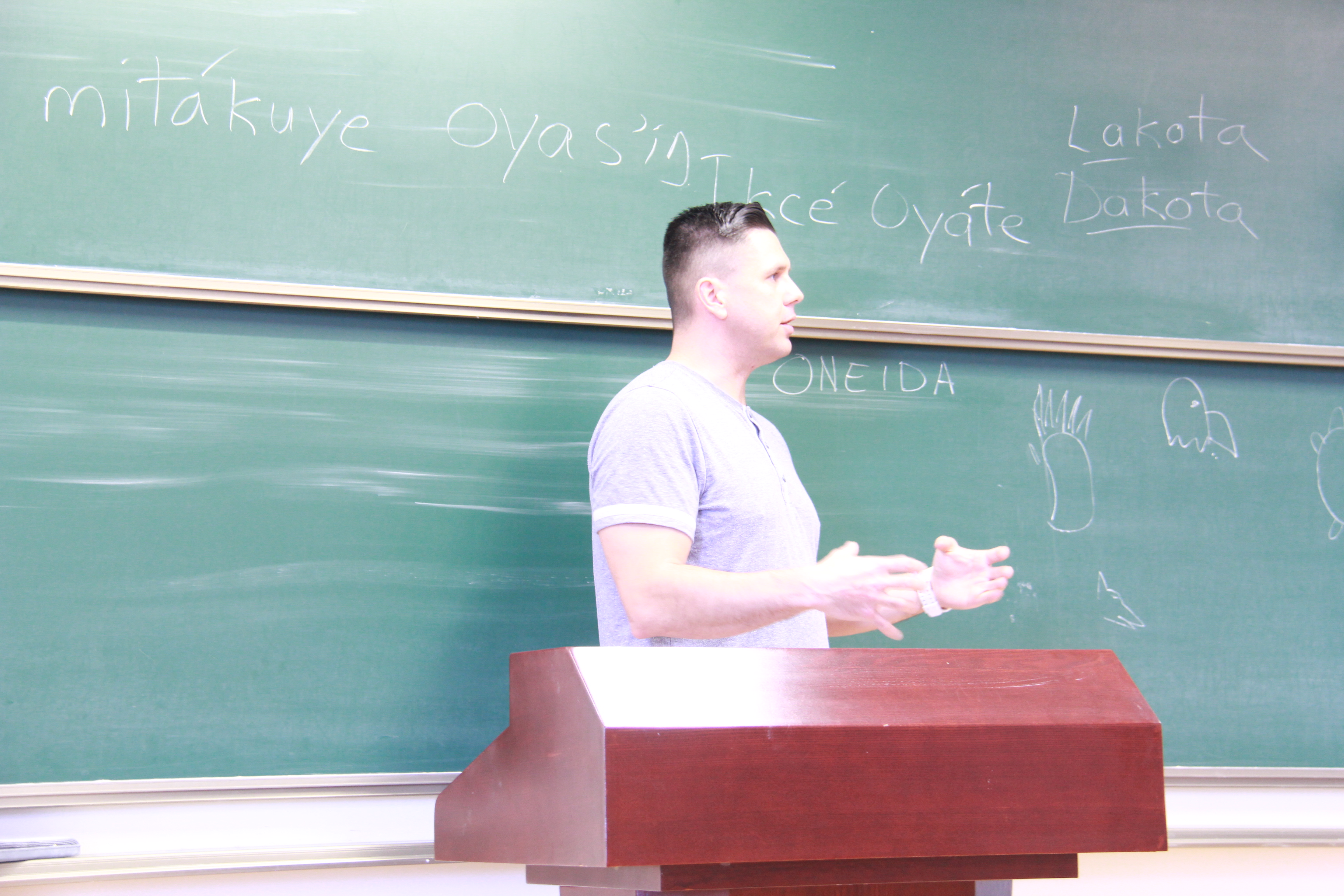 2015年4月23号下午15:30,太阳集团tyc539“土而根河”学术讲座在南区主楼603教室开讲。本次讲座由美国中西部原著民艺术家Kevin Loke 和Wayne Silas,Jr.主讲,讲座题目为《北美原住民文化引介》(An introduction to Native American traditions)。首先,两位主讲人以其所在部落原声歌唱和打鼓开始本次讲座,接着,两位原著民分别就其所在部落的语言、神话、宗教、婚姻、社会结构以及传统文化保留与变迁等进行了精彩的讲解,最后,讲座以Kevin Loke演奏传统长笛曲目结束。