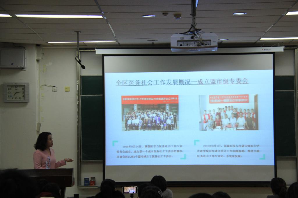 2020年12月9日晚,内蒙古自治区人民医院医务社工部主任陆俪平受邀来我院为社会工作学系的师生做了一场题为《“双工联动”模式下的内蒙古自治区医务社会工作发展》的讲座。讲座由社会工作学系主任孙丽敏老师主持。出席本次讲座的有社会工作学系的赵美荣老师、内蒙古自治区人民医院医务社工部的全体工作人员。讲座在太阳成集团tyc539北校区卓越楼阶梯教室2举行。