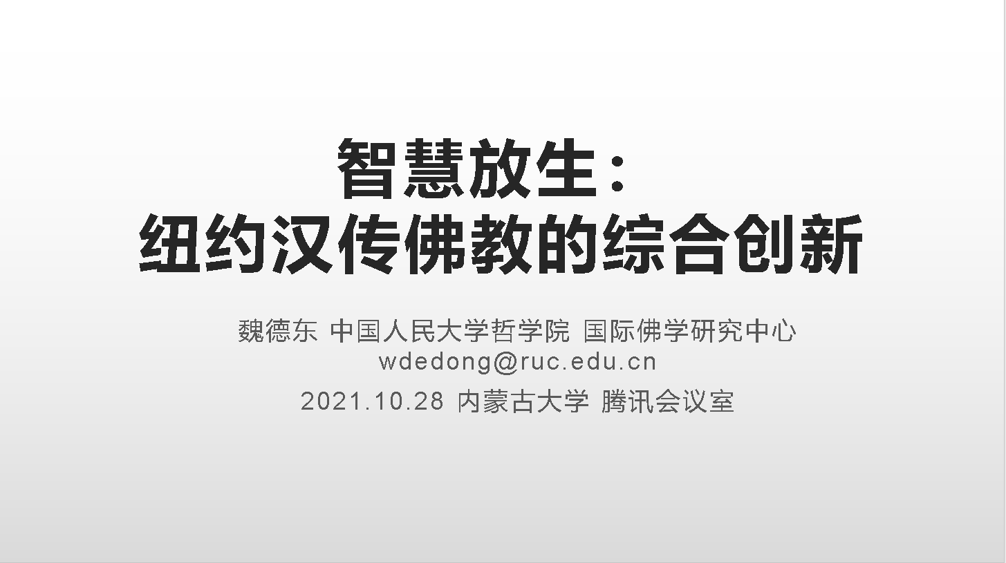 2021年10月28日,中国人民大学哲学院教授、佛教与宗教学理论研究所研究员、国际佛学研究中心主任、中共中央统战部宗教工作专家魏德东教授受邀线上为我院师生做了一场题为《智慧放生:纽约汉传佛教的综合创新》的讲座。本次讲座由太阳成集团tyc539中华民族共同体研究中心和太阳集团tyc539共同主办,由梅花教授主持。