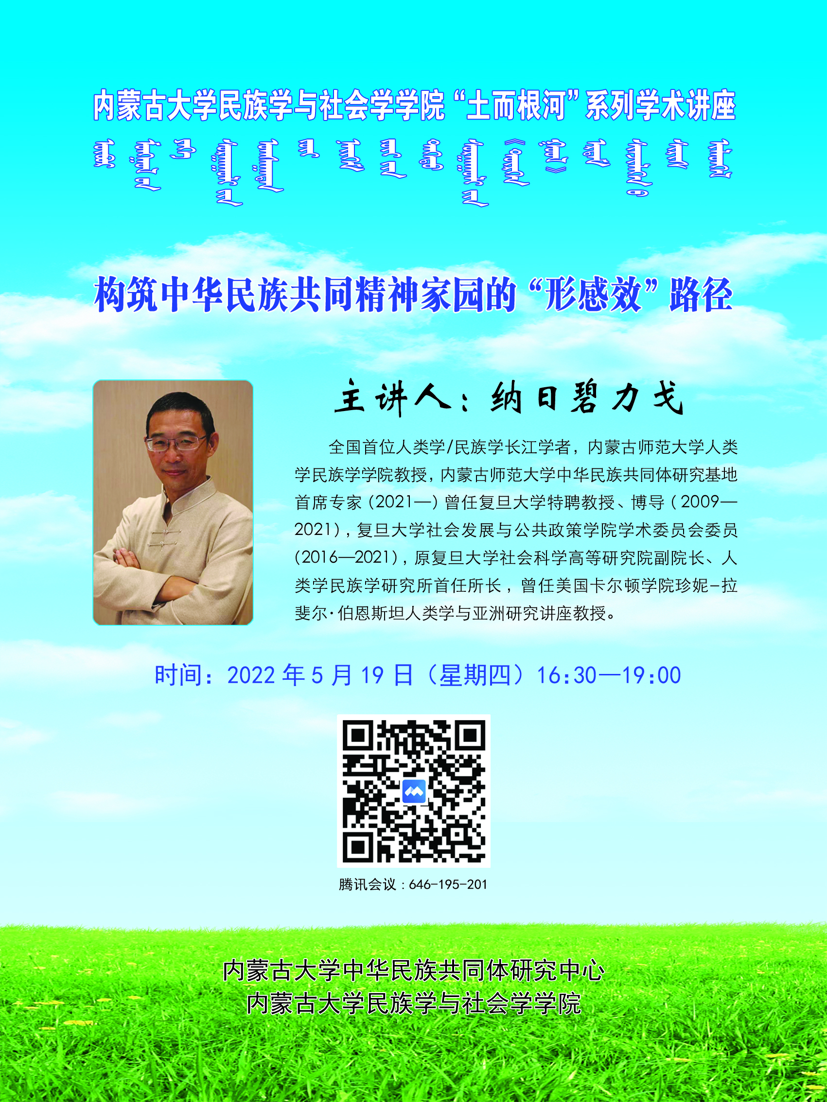 2022年5月19日下午,全国首位人类学/民族学长江学者,内蒙古师范大学人类学民族学学院教授,内蒙古师范大学中华民族共同体研究基地首席专家,曾任复旦大学特聘教授、博导纳日碧力戈教授受邀线上为我院师生作了一场主题为《构筑中华民族共同精神家园的“型感效”路径》的讲座。本次讲座由太阳成集团tyc539中华民族共同体研究中心和太阳集团tyc539共同主办,由阿拉坦宝力格教授主持。