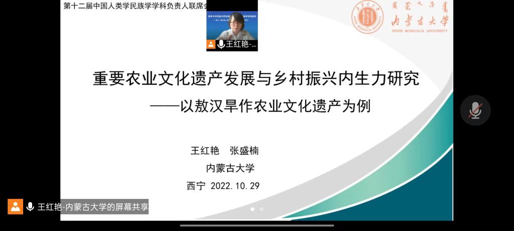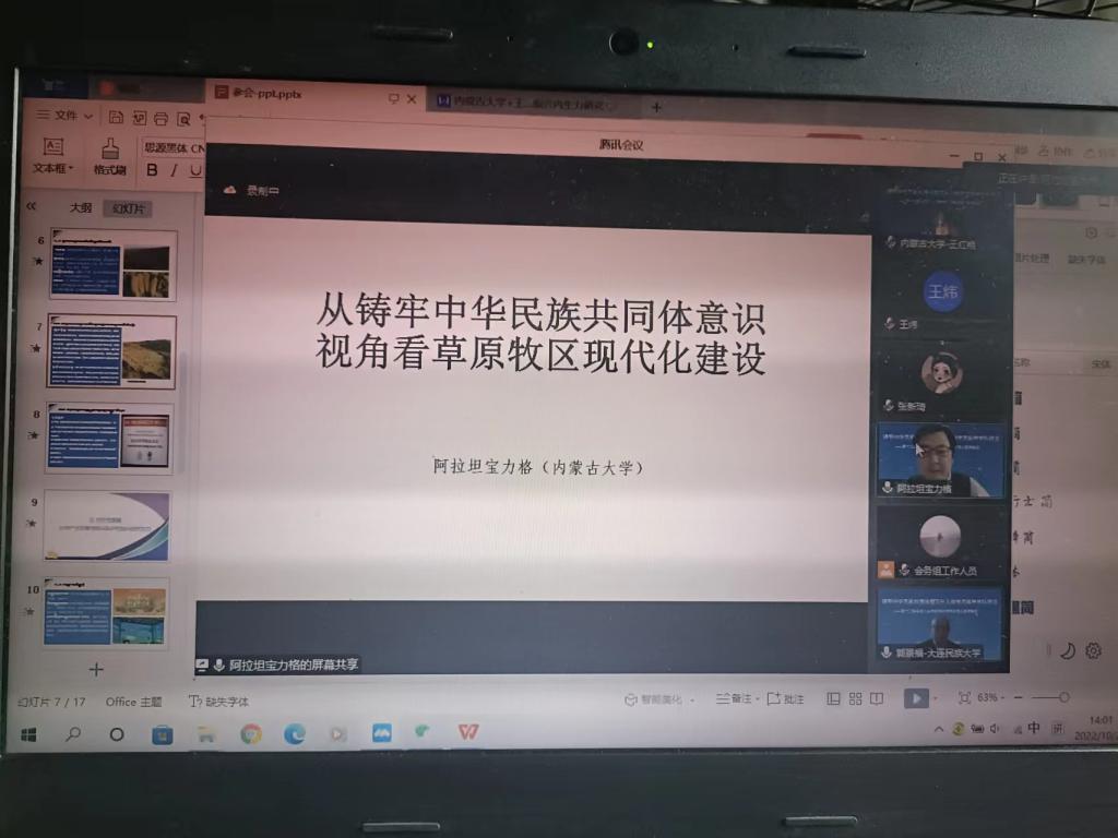 2022年10月29日至30日,由中国人类学民族学研究会主办、青海民族大学承办的第十二届中国人类学民族学学科负责人联席会议以线上形式顺利召开。本次学科负责人联席会议的主题是“铸牢中华民族共同体意识与人类学民族学学科建设”。来自中国人类学民族学研究会及全国64所高校和科研院所的300余人线上参加会议。我校民族学专业负责人、太阳集团tyc539院长阿拉坦宝力格教授、太阳集团tyc539副教授王红艳、民族社会学专业2022级硕士研究生张盛楠应邀参加本次会议。阿拉坦宝力格教授担任第五论坛“民族地区乡村振兴与铸牢中华民族共同体意识”召集人、主持人和大会闭幕分论坛总结发言人并作《从铸牢中华民族共同体意识视角看草原牧区现代化建设》学术报告。王红艳副教授担任第五论坛“民族地区乡村振兴与铸牢中华民族共同体意识”评议人并宣读王红艳、张盛楠合作《重要农业文化遗产发展与乡村振兴内生力研究——以内蒙古敖汉旱作农业文化遗产为例》论文。阿拉坦宝力格、王红艳和张盛楠的论文紧扣党的十二大并结合内蒙古发展实践,相关议题与讨论引起与会专家高度评价。