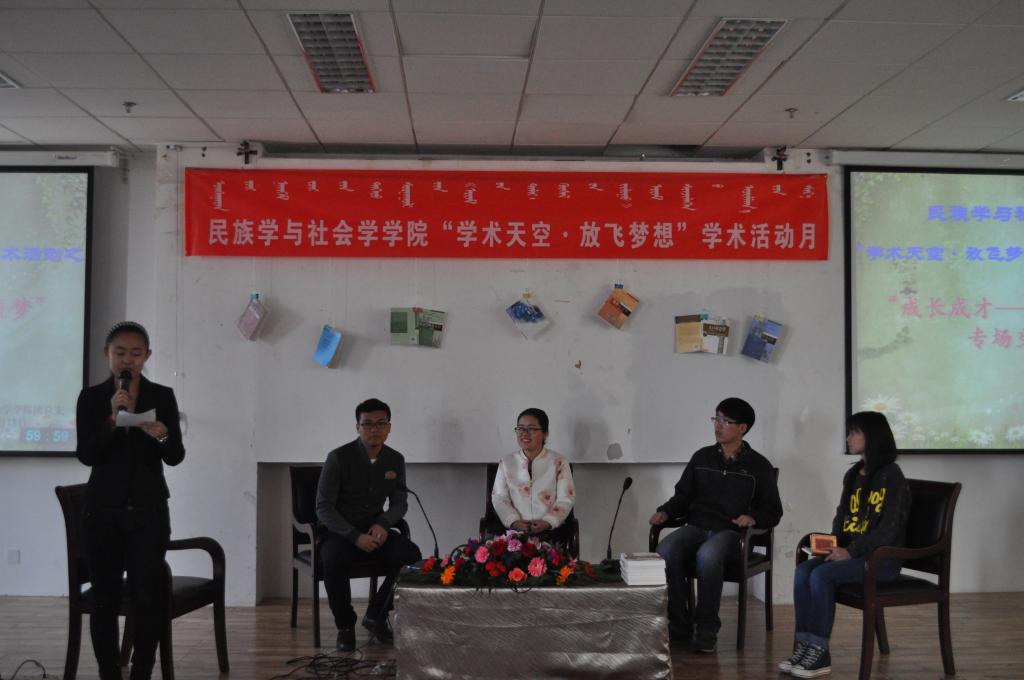 此次交流会太阳集团tyc539邀请到被保送至北京大学2011级社会学专业的刘一鸣、被报送至中央民族大学2011级民族学专业的李亚宁、考到中国社会科学院2011级汉授社会工作专业的胡那苏图、考到太阳成集团tyc5392011级汉授社会工作专业的王嘉欣四位考研、保研代表来分享经验。