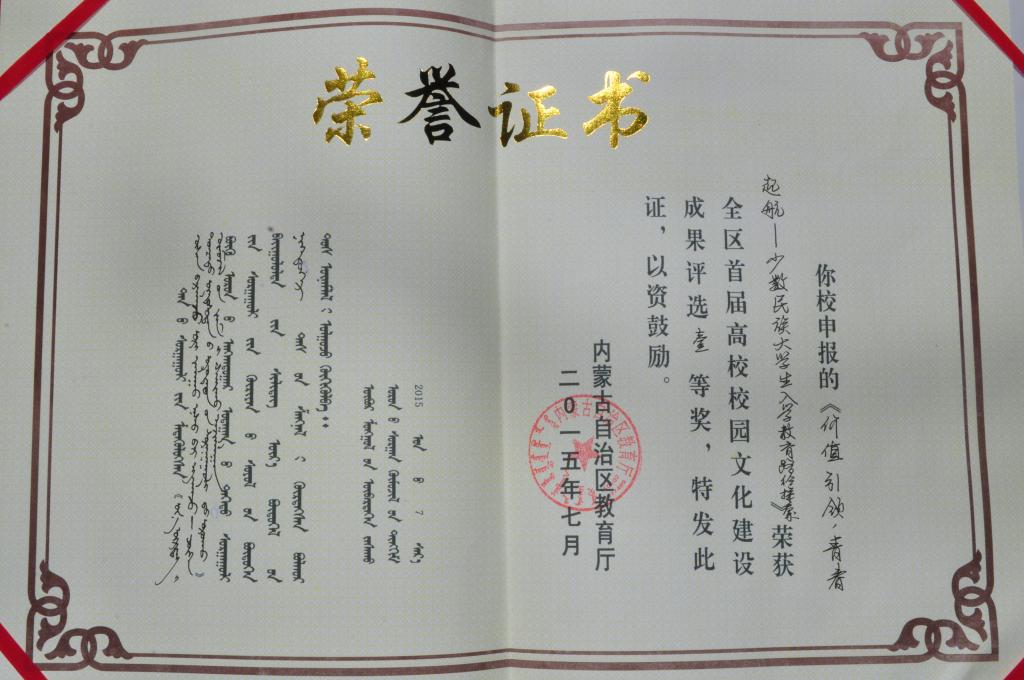 2015年7月,在自治区教育厅组织的首届高校校园文化建设成果评选活动中我校太阳集团tyc539申报的作品《价值引领,青春起航——少数民族大学生入学教育路径探索》荣获一等奖。