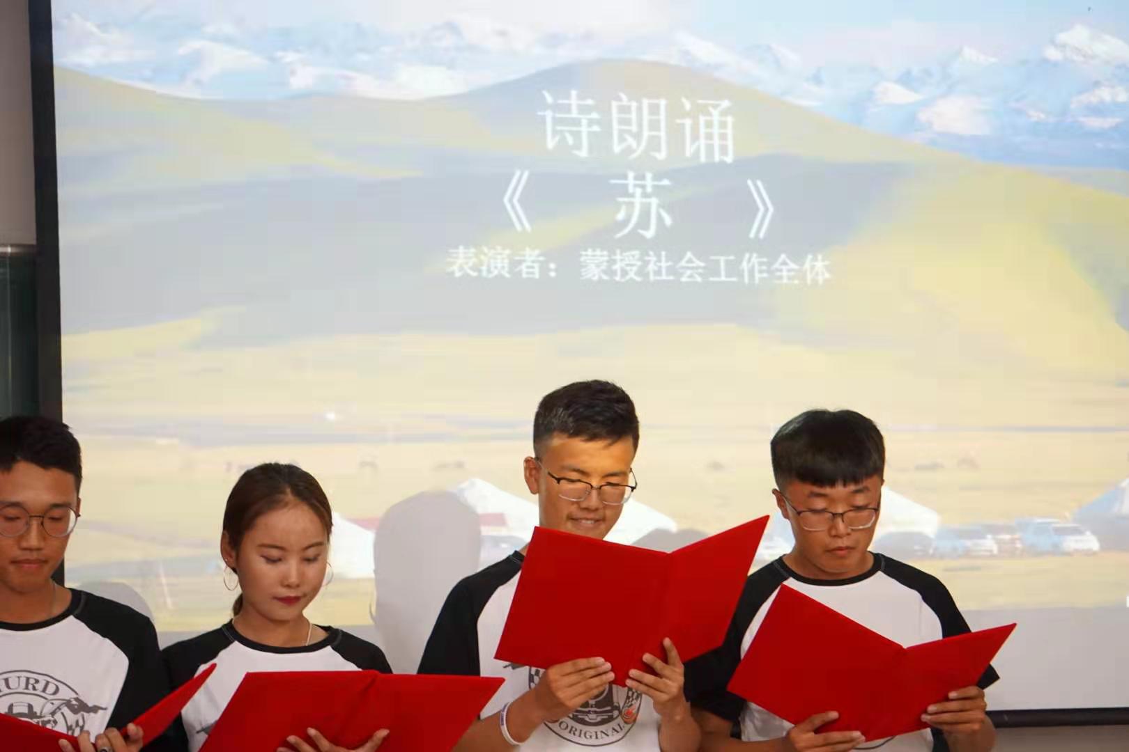 最后,新生们也对老师送上了祝福。两位学生代表祁然同学、张晶同学把教书比作伟业、师泽比作烛光,蒙授班的同学们以一首诗朗诵《苏》歌颂了老师们的辛勤付出;汉授班的同学们以《每当我走过老师窗前》、《国家》两首歌曲祝福祖国和老师。