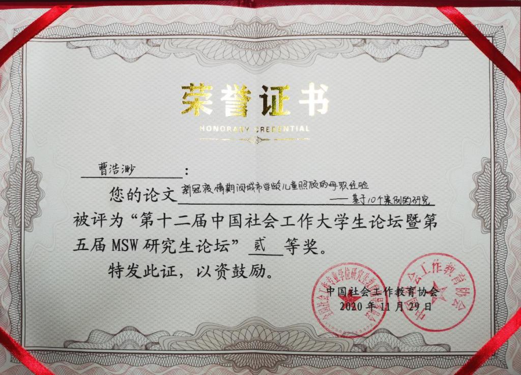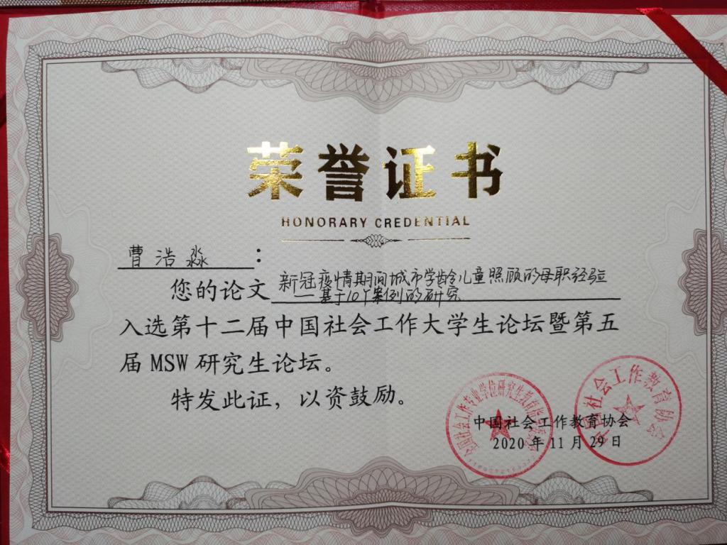 2020年11月29日,第十二届全国社会工作大学生论坛暨第五届研究生论坛顺利落下帷幕。我院社会工作专业2019级研究生曹浩淼同学参加并获得了二等奖的好成绩。