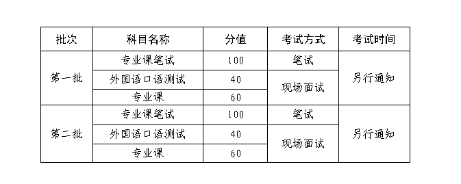 综合考核成绩(满分100分)=专业课笔试成绩(满分100分)*50%+现场面试成绩(满分100分,其中外国语口语测试成绩40分+专业课面试成绩60分)*50%。