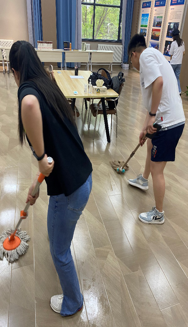 在本科生党支部老师的领导下,全体本科生党员成立5个党小组,全体成员每周对“铸牢中华民族共同体意识”基地进行一次日常打扫擦玻璃,每个党小组选拔两位普通话二级甲等的党员同志,就基地的内容设置进行讲解专业培训,每个党小组每周轮流做一次日常讲解。